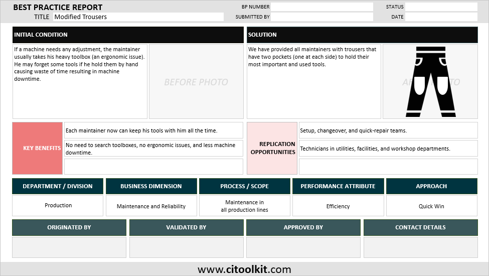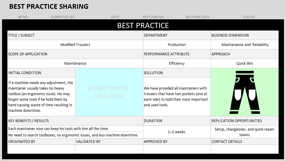 This template is a Microsoft Excel worksheet that can be easily customized to meet your specific needs. For example, you can modify the header to better align with your company’s standards. You may also add extra space or an additional worksheet to include more before-and-after photos or other supporting materials related to the best practice. A Microsoft PowerPoint version is also available.